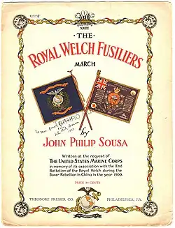 In 1900 the 2nd Battalion of the Royal Welch Fusiliers was part of the multinational force that lifted the Siege of the International Legations in Peking during the Boxer Rebellion; during this action they served alongside elements of the United States Marine Corps' 1st Marine Regiment. In 1929, at the request of surviving Marine veterans who had served at Peking, the then 75-year-old Sousa composed a tribute march to the British regiment entitled "The Royal Welch Fusiliers." A medley-march, this composition included the “World Turned Upside Down,” “Hymn of the Marines,” “Men of Harlech,” and “God Bless the Prince of Wales.”[3] However, Commandant of the Marine Corps Wendell Cushing Neville, a veteran of Peking, was dissatisfied with this first attempt, and told Sousa in a letter that he would prefer an original composition, so Sousa completed a second version of the march the following year.[4][5]