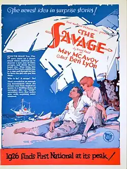The Savage is a 1926 American silent romantic comedy film directed by Fred C. Newmeyer and starring Ben Lyon and May McAvoy. The film was produced and distributed by First National Pictures. Based on a short story by Ernest Pascal, it tells the story of a science writer who tries to discredit rivals of his by posing as a wild man.[1][2]