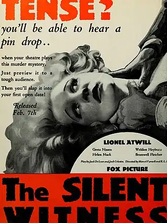 The Silent Witness is a 1932 American mystery film directed by Marcel Varnel and starring Lionel Atwill, Greta Nissen, and Helen Mack.[1] It was adapted from a play by Jack DeLeon and Jack Celestin.[2][3] The film's sets were designed by the art director Duncan Cramer who worked on many Fox Film productions of the era.