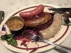 A wurstplatte from The Student Prince, with knackwurst, boar and cranberry, and bratwurst (top to bottom)