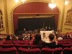 The auditorium has a parterre-level orchestra and a single balcony, with a small stage behind the proscenium arch.[25][26] The auditorium has a seating capacity of 1,495.[27] Every effort was taken to ensure that no seats had obstructed views,[26][28] which led to the Town Hall's long-standing mantra "Not a bad seat in the house".[4] The balcony is cantilevered from the structural framework, which obviated the need for columns that blocked audience views.[22] The balcony has a loge, or theatrical box.[19][26] The front of the balcony contains a wrought-iron balustrade. The auditorium retains most of its original wicker seat designs, except for the loge, where modern theatrical seats have been installed.[29] The original seats were capable of unusually high levels of acoustic absorption; they were replaced in the 1980s by seats with similar acoustic qualities.[30] The writer Harold C. Schonberg wrote that only the seating on the balcony had good acoustics, as the balcony's presence muffled the sounds at orchestra level.[31]