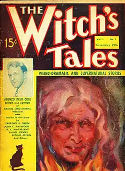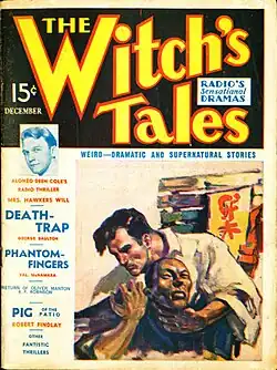 The Witch's Tale was a radio program that began on American radio in May 1931. A weekly anthology show, it was the first radio horror program, and soon became quite popular.[1][2][note 1] In 1936, the magazine The Witch's Tales appeared as a companion to it, perhaps inspired by The Shadow, a successful pulp magazine which had also been launched as the companion of a radio program of the same name. The Witch's Tales was published by The Carwood Publishing Co., a small and relatively inexperienced firm. The named editor of the magazine was Alonzo Deen Cole, who wrote the radio episodes, but the editorial work was actually done by Tom Chadburn.[4] Having both a pulp magazine and radio show act as vehicles for Cole's work is an early example of the 21st century's media industry's approach, with content tied together across more than one media platform,[5] but although Street & Smith demonstrated that this could be done successfully for The Shadow, Carwood did little to promote the radio show in the magazine, probably because of their inexperience.[6] Only one more issue appeared, the following month; it is unlikely that the publisher could have received sales data on the first issue by that time, so there may have been reasons other than poor sales for the magazine's short run,[4] perhaps including weak financing and distribution.[6]