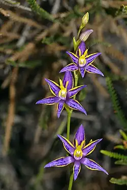 Thelymitra apiculata, commonly called Cleopatra's needles,[2] is a species of orchid in the family Orchidaceae and endemic to the south-west of Western Australia. It has a single erect, curved, dark green leaf with a purplish base and up to twelve purplish flowers with darker blotches and golden yellow edges. There are two yellow arms on the sides of the column, each ending with a needle-like point.