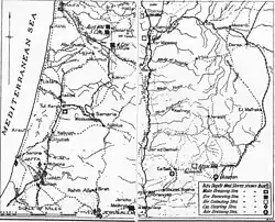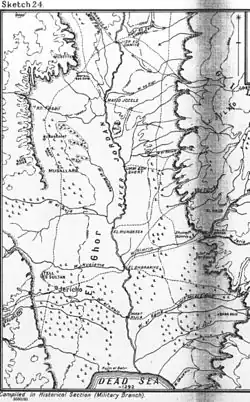 The Ottoman front line had been strengthened after the Second Transjordan attack. It began in the south, where Ottoman cavalry guarded tracks to Madaba before continuing with strongly wired entrenchments. In front of these, advanced posts extended from the foothills opposite the ford across the Jordan River at Makhadet Hijla to about 4 miles (6.4 km) north of the Jericho to Es Salt road. The road had been cut at the Ghorianyeh Bridge before the First Transjordan attack, in the vicinity of Shunet Nimrin. The front line was strengthened by advanced posts which were also wired on the left flank at Qabr Said, Kh. el Kufrein and Qabr Mujahid. From their right flank in the foothills a wired line of redoubts and trenches facing south ran from 8,000 yards (7,300 m) north of Shunet Nimrin, across the Jordan Valley to the Jordan River, 1,000 yards (910 m) south of the Umm esh Shert ford.[12][13][14] This line was continued west of the river by a series of individual "wired-in redoubts with good fields of fire,"[15] then as a series of trenches and redoubts along the northern or left bank of the Wadi Mellaha. These were followed by a "series of trenches and redoubts towards Bakr Ridge which were entrenched but not wired. A strong advanced position of well built sangars and [sic] [which were] wired in was held at Baghalat."[13] Bakr Ridge in the Judean Hills was situated to the west of the salient at El Musallabe which was held by the EEF. The Ottoman front line was supported by entrenched positions on Red Hill beside the Jordan River, which was also the site of their main artillery observation point.[12][13][14]