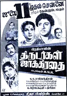 Thirudargal Jakkirathai (transl. Beware of Thieves) is a 1958 Indian Tamil-language film directed by B. Narasimha Rao.[2] The film stars S. S. Rajendran and G. Varalakshmi. It was simultaneously produced in Telugu with the title Dongalunnaru Jagratha. The film was released on 11 July 1958.[3]