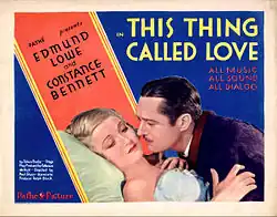 This Thing Called Love is a 1929 American romantic comedy pre-Code film directed by Paul L. Stein and starring Edmund Lowe, Constance Bennett, Ruth Taylor, Roscoe Karns, and ZaSu Pitts. Jean Harlow appears in a cameo role as she was not yet famous. The film is based on the play This Thing Called Love, a Comedy in Three Acts, by Edwin J. Burke.[1]
