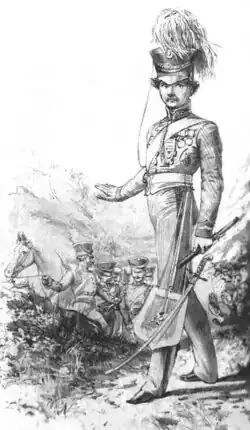 Having arrived at Fort St. Julien, Lisbon, on HMS Plover in November 1808, Bunbury fought in the Peninsular War. He carried his regiment's colours at the Battle of Talavera, 27–28 July 1809.[1] From 17 August 1809, he served with the 91st Regiment of Foot with the rank of lieutenant.[1] Wounded during the war, he considered becoming an artist after it ended, and spent time in Paris. In 1822, he joined the 80th Regiment of Foot, based in Malta and served there from 1823 to 1827.[1] In 1825, he transferred to the 85th Regiment of Foot for a period of service in Spain before returning to the 80th Regiment, with which he later served in England.