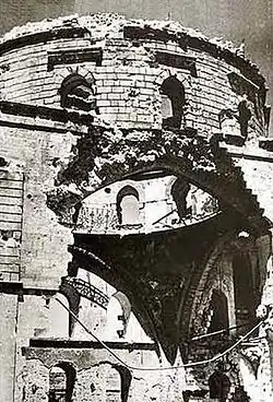 The first major Haganah stronghold to fall was the Nissan Bek Synagogue, the building whose dome had been donated by the Emperor Franz Joseph. It was essential to Rusnack defence plan and the Haganah fought tenaciously to hold on to it…Fawzi el Kutub finally ordered eight of his men to rush across an open space and place a charge at the base of the synagogue. All of them were killed or wounded. No one would volunteer for a second try. Hoping to force his men's hands by his example, Kutub sprinted across the space himself. When he got to the base of the synagogue, he saw that no one had followed him. Like a spider he pressed himself up against its wall until finally the Tunisian to whom he had promised a wife rushed out to him carrying a fifty-five pound charge. The explosion barely chipped the wall. Three more unsuccessful attempts were required before Kutub managed to blow a hole in the synagogue wall and a party of Legionnaires rushed through the smoke into Nissan Bek's interior. Sure that the Haganah would counterattack and that the irregulars swarming into the synagogue would quickly turn to looting, Kutub decided to destroy it with a 220-pound charge. His strongest follower, a one-eyed former porter in the railroad station nicknamed the Whale, staggered up with the explosive. A terrible roar shook the quarter and blew out the heart of the building. As the smoke cleared and the frightful devastation caused by the bomb became apparent, Kutub heard a cry of consternation rising from the Jewish posts around him. It was quickly replaced by a triumphant yell. A small group of Haganah led by Judith Jaharan counterattacked and took the smoking ruins of Nissan Bek from the Arabs. As Kutub had suspected, the irregulars had spent their time looting the synagogue. The Haganah found the bodies of Arab irregulars killed in their counterattack with altar cloths around their waist, pages of the Torah stuffed into their shirts, pieces of chandeliers and lamps in their pockets.[14]