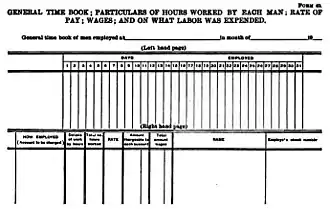 In the 19th century when organizations started to grow a separate register of labour hours emerged, which was called a time book. There were used to keep account of the work done.[2] Loudon (1826) explained, that in gardening the books necessary for the system of keeping accounts are, the time-book, the cash-book, and the forest or plantation book.[3] Loudon described how time books were handled in those days: