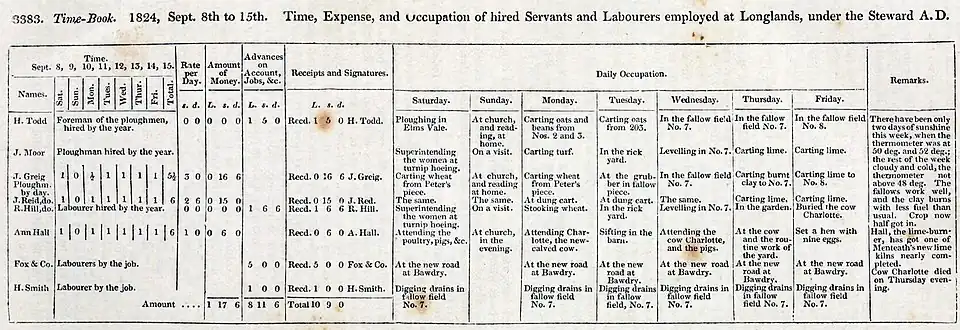 In those days time books, as Loudon explained, were used on farms, but also in mines[4] and in the emerging Iron and steel industry.[5] Occasionally time books were also used to register the time, that a working steam engine had been in operation.[6]