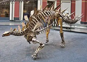 This timeline of stegosaur research is a chronological listing of events in the history of paleontology focused on the stegosaurs, the iconic plate-backed, spike-tailed herbivorous eurypod dinosaurs that predominated during the Jurassic period. The first scientifically documented stegosaur remains were recovered from Early Cretaceous strata in England during the mid-19th century.[1] However, they would not be recognized as a distinct group of dinosaurs until Othniel Charles Marsh described the new genus and species Stegosaurus armatus in 1877, which he regarded as the founding member of the Stegosauria.[2] This new taxon originally included all armored dinosaurs. It was not until 1927 that Alfred Sherwood Romer implemented the modern use of the name Stegosauria as specifically pertaining to the plate-backed and spike-tailed dinosaurs.[1]