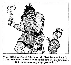 Glover's title character is confronted by a giant (a panel from Skeeter in Fairyland published in The Sun, 6 January 1935).
