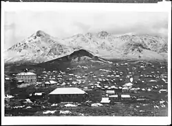 The area where the Tonopah Historic Mining Park is located was part of the mining operations done by several Tonopah mining companies, including Tonopah Mining Company, founded in 1901.[3][4] A commonly repeated lore of how silver was discovered in these mines was through the story of Jim Butler, who accidentally stumbled upon it when he was going to throw a rock (which happened to be a silver ore) to his mule. Through the help of his friend Tasker Oddie, Jim and his wife, Belle, would later found out the value of the ore, and with several others, would offer mine leasing rights for the area. Eventually, the Butlers would sell their mine leasing claim to the Tonopah Mining Company, though the company itself would eventually cease to operate by 1956.[3][5][6] The area where the mine used to be remains largely in place, and in 1992, the place was co-opted by the Tonopah Historic Mining Park Foundation as a preservation site for the Tonopah mining history.[4]