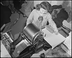 Rose Nakagawa, former student from San Francisco, California, working as a mimeograph operator on the Topaz Times.