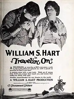 Travelin' On is a 1922 American silent Western film directed by Lambert Hillyer, written by William S. Hart and Lambert Hillyer, and starring William S. Hart, James Farley, Ethel Grey Terry, Brinsley Shaw, Mary Jane Irving, Bob Kortman, and Willis Marks. It was released on March 5, 1922, by Paramount Pictures.[1][2][3] A copy of the film is in the Library of Congress.[1]