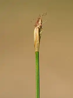 It flowers from May to July, rarely later.[5] The one or two bracts are similar to the glumes and are about as long as the inflorescence. The inflorescence consists of a single, terminal, erect spikelet. With a length of 5 to 10 millimeters, the spikelets are obovate or elongated to club-shaped and contain three to twenty flowers. The flowers contain three stamens and three stigmas.