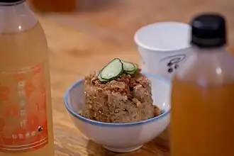 Tube rice pudding (Chinese: 筒仔米糕; pinyin: Tǒng zǐ mǐ gāo; Pe̍h-ōe-jī: tâng-á-bí-ko) is a Taiwanese dish consisting of a stir-fried glutinous rice mixture that is seasoned and steamed in a bamboo tube. Tube rice pudding is a cylindrical shape caused by the steaming process in a tube.[1] Though regionally variable, the dish is typically served with shiitake, minced pork shallots, and complemented by sweet chili sauce.[2] The dish is considered one of the national dishes of Taiwan and was featured on the 40 of the best Taiwanese foods and drinks by CNN Travel.[3]