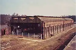 The original two-road locomotive shed (code number 75F) was capable of accommodating six engines and situated to the south of the station. It was opened in 1866[8] and replaced in 1891 by a larger four-road shed located to the north-west of the station.[9] Following bomb damage on 20 November 1940 during the Second World War, the slate roof of the engine shed was replaced with corrugated asbestos.[10] It was closed to steam locos in June 1965 but the tracks were used for storage of engineers rolling stock until the late 1970s when they were removed.