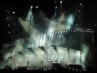 During the initial London press conference, it was revealed that music dating back as far as 1973 would be performed on the tour, with the songs "Domino", "Afterglow", "In the Cage" and "Los Endos" cited as probable inclusions in the set.[7] Rehearsal footage screened at the conference also showed the band working on "No Son of Mine" and "Home by the Sea".[8] It was confirmed that no material from the post-Collins album Calling All Stations would be performed, and that the group were not planning on playing their 1972 epic "Supper's Ready".[7] It later evolved that a small piece of "Stagnation", from the pre-Collins album Trespass would be included as part of the "Firth of Fifth/I Know What I Like" medley (as it has been since their 1977 tour).