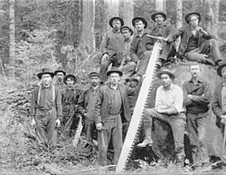 A two-man saw (known colloquially as a "misery whip"[1]) is a saw designed for use by two sawyers. While some modern chainsaws are so large that they require two persons to control, two-man crosscut saws were primarily important when human power was used.[2] Such a saw would typically be 1 to 4 m (4 to 12 feet) long, and sometimes up to 5 m (16 feet), with a handle at each end. In some cases, such as when felling Giant Sequoias, sawblades could be brazed together end-to-end in order to create longer saws.