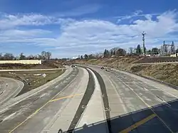 The Schuylkill River crossing near Valley Forge had been a frequent source of congestion on this segment of US 422. Following the closure of another bridge over the river that ran parallel to US 422 in 1993, drivers travelling between PA 363 and PA 23 were forced to enter US 422, merge on to cross the river, then immediately exit at the next interchange, causing significant congestion in the area. Multiple proposals were made over the years to rebuild the former bridge, which was demolished in 1995. However, due to environmental concerns over the construction of the bridge, which would have been in close proximity to Valley Forge National Historical Park, no proposal ever moved forward. One fix was made when a third westbound lane between the PA 23 and PA 363 interchanges was constructed in January 2009.[30] The project was completed by squeezing three westbound lanes onto the existing Schuylkill River crossing, shortening the lanes to 11 ft (3.4 m) and narrowing the median guard. The PA 23 interchange was also restructured in this project.[31][32] Despite the widening of the highway, congestion still lingered in the area, and the issue of the age of the twin bridges began to arise, as they were built as part of the original County Line Expressway in the 1960s. As a result, in 2016, a $97 million project began to replace the bridges with a wider bridge, and to improve the PA 363 and PA 23 interchanges. The project was completed in October 2020, with the current bridge now including four mainline travel lanes and a weaving lane in each direction for direct access between PA 363 and PA 23.[33][34]