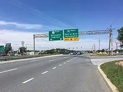 Construction on an interchange with the Delaware Memorial Bridge approach at Farnhurst began on July 12, 1950.[61] On August 16, 1951, the Delaware Memorial Bridge opened to traffic.[62] US 40 was rerouted to use the new Delaware Memorial Bridge to cross the Delaware River, being realigned to follow US 13 north from Hares Corner to Farnhurst.[51] Upgrades to the Farnhurst interchange were finished in July 1961 that provided a connection to the Delaware Turnpike (I-95) that opened on November 14, 1963.[63] In 1954, there were plans to replace the intersection with DE 41/DE 141 in Basin Corner with a modified cloverleaf interchange in an effort to reduce traffic congestion.[53] Construction on the interchange began in September of that year.[54] The interchange between US 13/US 40/US 202 and DE 41/DE 141 was completed in 1956.[56][57] Plans were made to widen the Philadelphia Pike to a four-lane road between Bellevue Road and Claymont in 1954.[53] The widening project was completed in 1956.[56]