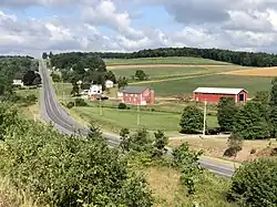 Alt US 40 branches from US 40 near exit 14 on I-68 at Keysers Ridge.[4] It runs parallel to I-68 through northern Garrett County as a two-lane road with truck lanes on some uphill sections.[4] The annual average daily traffic (AADT)—that is, the number of cars that use the road per day, averaged over the course of one year—is 1,831 at the western end of Alt US 40. For comparison, the parallel section of I-68 has an AADT of 14,271.[6] Alt US 40 passes through some of the most mountainous terrain in Maryland. The route runs perpendicular to the mountain ridges in Garrett County, and as a result much of the section of the road in Garrett County runs uphill or downhill. The first mountain encountered by the highway east of Keysers Ridge is Negro Mountain. The road passes over the mountain at an elevation of 3,075 feet (937 m), which is the highest point on Alt US 40, and was also the highest point along the National Road.[7] East of Negro Mountain, the highway enters Grantsville, where traffic increases, with the AADT increasing to 3,711, the highest traffic density on Alt US 40 in Garrett County. In Grantsville, Alt US 40 meets MD 669, which connects with Pennsylvania Route 669 toward Salisbury, Pennsylvania.[6] A short distance east of this intersection, the highway meets MD 495, which junctions with I-68 and continues southward toward Oakland.[8] East of Grantsville, Alt US 40 passes over the Casselman River on a steel bridge built in 1933. Downstream from this bridge is the Casselman River Bridge State Park, centered on the stone arch bridge which originally carried the National Road over the Casselman River.[9]