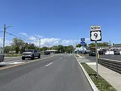 The land gets more built up as the road enters Lanoka Harbor.[4] A crossing of the Cedar Creek takes the route into Berkeley Township and US 9 continues north as Atlantic City Boulevard.[1][4] At Bayville, the route is lined with businesses and makes a turn to the northwest.[4] The road briefly forms the border between Berkeley Township to the southwest and Pine Beach to the northeast prior to crossing into Beachwood. In Beachwood, Route 166 heads north as the route widens into a four-lane divided highway.[1] Past Route 166, US 9 turns more to the west past residential neighborhoods as a four-lane undivided road, entering South Toms River, where it widens into a divided highway.[1][4] US 9 crosses with CR 530 prior to merging onto the GSP again at another interchange. At this interchange, the southbound direction of US 9 briefly runs concurrent with eastbound CR 530.[1]