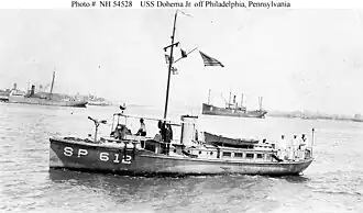 Dohema Jr. was built as a private motorboat of the same name by her owner, Edwin Binney of Sound Beach, Connecticut, in 1912. In 1917, the U.S. Navy acquired her under a free lease from Binney for use as a section patrol boat during World War I. She was commissioned as USS Dohema Jr. (SP-612) on 2 June 1917.