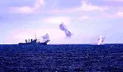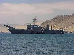 La Moure County was deemed damaged beyond repair.[14] The ship was decommissioned and struck from the Naval Vessel Register on 17 November 2000.[9] After five weeks of work by divers stabilizing the vessel, La Moure County was towed by the Chilean icebreaker Almirante Óscar Viel to Talcahuano, Chile where further repairs were deemed uneconomical. Having been stripped of all usable material, the damaged hulk of La Moure County was towed out to sea and sunk as a target on 10 July 2001 during UNITAS 2001.[18]
