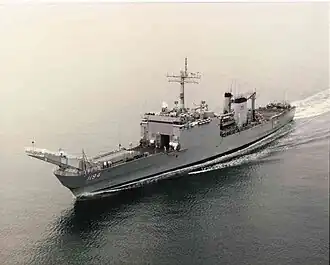 During the Gulf War, La Moure County was part of Amphibious Group 2 (PhibGru2). Tasked with transporting part of the 4th Marine Expeditionary Brigade (4th MEB) via the Mediterranean to the Persian Gulf, the group was divided up into transit groups, with La Moure County joining Transit Group 3.[11][a] Transit Group 3 departed Morehead City, North Carolina on 21 August 1990 and united with the other transit groups off Masirah Island on 16 September. Transit Group 3 rejoined PhibGru2. PhibGru2 was split back into respective transit groups on 24 March 1991 and Transit Group 2 returned to Little Creek on 17 April after a ceasefire had been declared on 1 April.[12][13] In 1995 the ship was transferred to the Naval Reserve Force.[14]