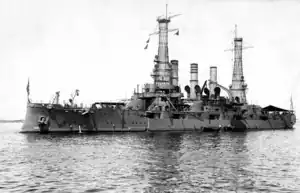 New Hampshire was laid down on 1 May 1905 at the New York Shipbuilding Corporation in Camden, New Jersey. She was launched on 30 June 1906. The ship was commissioned into the US Navy on 19 March 1908; her first commander was Captain Cameron Winslow. After completing final fitting-out work, New Hampshire transported a Marine Expeditionary Regiment to Colón, Panama on 20 June, arriving six days later. She then made a series of visits to ports on the eastern coast of North America, including Portsmouth, New York, and Bridgeport, along with a stop in the Canadian province of Quebec. The ship was then overhauled in New York, followed by training exercises in the Caribbean Sea. On 22 February 1909, she participated in a Naval Review for President Theodore Roosevelt to greet the return of the Great White Fleet in Hampton Roads, Virginia.[3] During this period, Ernest King, later the Chief of Naval Operations during World War II, served aboard the ship in the engine room.[4]