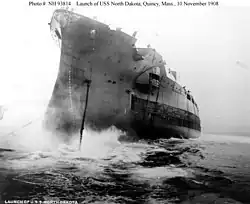 The keel for North Dakota was laid down at the Fore River Shipyard in Quincy, Massachusetts, on 16 December 1907. She was launched on 10 November 1908, and completed on 11 April 1910, thereafter being commissioned into the fleet.[1] On 8 September 1910, the ship suffered an oil-tank explosion and fire while at sea. Six men—Chief Watertenders August Holtz and Patrick Reid, Chief Machinist's Mates Thomas Stanton and Karl Westa, Machinist's Mate First Class Charles C. Roberts, and Watertender Harry Lipscomb—each received the Medal of Honor "for extraordinary heroism in the line of his profession" during the fire.[5]