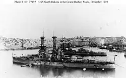 USS North Dakota (BB-29) was a dreadnought battleship of the United States Navy, the second member of the Delaware class, her only sister ship being Delaware. North Dakota was laid down at the Fore River Shipyard in December 1907, was launched in November 1908, and commissioned into the US Navy in April 1910. She was armed with a main battery of ten 12-inch (305 mm) guns and was capable of a top speed of 21 kn (24 mph; 39 km/h). North Dakota was the first vessel of the US Navy to be named after the 39th state.