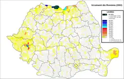 The Ukrainians of Romania (Ukrainian: Українці Румунії, romanizedUkrayintsi Rumuniyi, Romanian: Ucrainenii din România) are the third-largest ethnic minority in Romania. According to the 2011 Romanian census they number 51,703 people, making up 0.3% of the total population.[2] According to the 2021 Romanian census, there were 45,835 people who identified themselves officially as Ukrainians (0.24%), and 40,861 who declared that their language was Ukrainian.[1] Ukrainians claim that the number is actually 250,000–300,000.[8] Ukrainians mainly live in northern Romania, in areas close to the Ukrainian border. Over 60% of all Romanian Ukrainians live in Maramureș County (31,234), where they make up 6.77% of the population. According to the U.S. Census Bureau, in 2015, there were 345 ethnic Ukrainians born in Romania who lived in the United States of America at that time.[9]