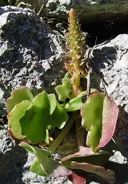 The plant often grows on shady walls or in damp rock crevices that are sparse in other plant growth, where its succulent, dark green leaves develop in rosettes that are about 7 cm (3 in) wide. Horizontal navelwort is similar to common navelwort in many respects, but is noticeably more succulent.
