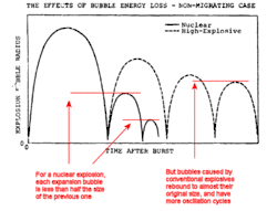 The drastic 60% loss of energy between oscillation cycles is caused in part by the extreme force of a nuclear explosion pushing the bubble wall outward supersonically (faster than the speed of sound in saltwater). This causes Rayleigh–Taylor instability. That is, the smooth water wall touching the blast face becomes turbulent and fractal, with fingers and branches of cold ocean water extending into the bubble. That cold water cools the hot gas inside and causes it to condense. The bubble becomes less of a sphere and looks more like the Crab Nebula—the deviation of which from a smooth surface is also due to Rayleigh–Taylor instability as ejected stellar material pushes through the interstellar medium.