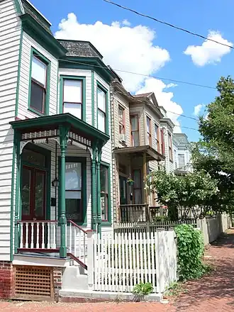 The architecture of the neighborhood varies, with buildings in the Federal, Greek Revival, Italianate, Queen Anne, and Art Deco styles.[5]