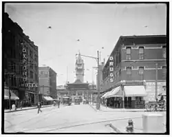 Looking down 17th Street towards the second Union Station building and the Mizpah Arch, c. 1908