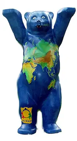 Buddy Bears are painted, life-size fiberglass bear sculptures developed by German businesspeople Klaus and Eva Herlitz, in cooperation with sculptor Roman Strobl. They have become a landmark of Berlin and are considered unofficial ambassadors of Germany. The outstretched arms of the standing Buddy Bear symbolise friendliness and optimism.[1] The first bears were displayed at an artistic event in Berlin in 2001.[2]