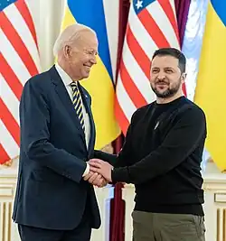 Joe Biden made his first visit to Kyiv since the start of Russia's invasion of Ukraine, on February 20, 2023.[54][55] Only two journalists followed him, having been sworn to secrecy three days previous due to security concerns, and his travel arrangements had not been made public even just before his arrival.[56] Biden's visit received a mixed reaction.[57][58][59]