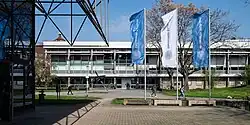 In 1961 the university was able to build a dedicated facility with the help of the Max-Kade-Foundation.[2] Planned and erected by the Stuttgart architectural firm Volkart und Zabel,[3][4] the building is modelled after American academic libraries. There are notable similarities, for example, to the reading rooms of S. Price Gilbert Memorial Library[5] of the Georgia Institute of Technology.[6] Due to subsequent developments in library operations over the past 60 years, the library today faces significant space and structural problems. In 2018 the library building was added to the list of cultural heritage sites in the state of Baden-Württemberg.[7]