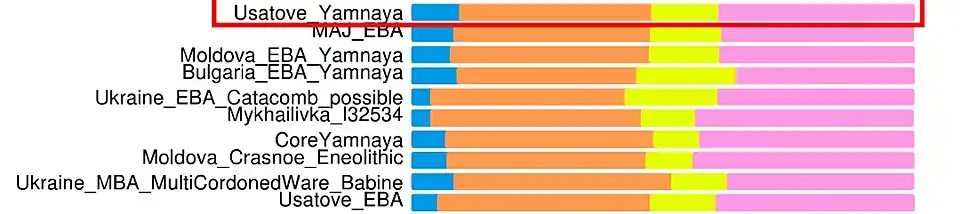 Recent studies indicate that Usatove ancestry consists of equal parts of the ancestry of the Lower Volga-Caucasus (CLV, PVgroup) and Trypillia.[11]