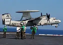 The squadron was deployed aboard USS Enterprise prior to the decommissioning of the ship in 2013 and then transferred to Carrier Air Wing 3, which is assigned to USS Dwight D. Eisenhower.[2][3] On 1 January 2020, the squadron was redesignated as Airborne Command and Control Squadron 123 along with the other 8 USN E-2 squadrons to reflect the expanded role and responsibilities of the aircraft outside its original AEW focus.[2][4]