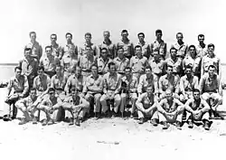 Marine Fighter Squadron 223 (VMF-223) was commissioned on 1 May 1942 at Marine Corps Air Station Ewa, Oahu, Hawaii.[4] The "Bulldogs" first operational aircraft was the Brewster F2A Buffalo. They left Hawaii for combat equipped with the Grumman F4F Wildcat. VMF-223 became the first fighter squadron committed to combat during the Battle of Guadalcanal when they landed at Henderson Field on 20 August 1942.[5] Upon arriving, the squadron became part of the Cactus Air Force and for the next two months slugged it out with Japanese pilots, based out of Rabaul, for control of the skies over Guadalcanal. VMF-223 departed the island on 13 October 1942 having accounted for 83 enemy aircraft shot down including that of Japanese ace Junichi Sasai.[6] The two leading aces in the squadron were the commanding officer, Major John L. Smith, with nineteen confirmed shoot downs and Marion E. Carl who was credited with sixteen.[7] Smith was to be awarded the Medal of Honor for heroism and Captain Carl would earn the first of his two Navy Crosses for these actions.[6] These victories would come at the cost of six pilots killed and six wounded, and only eight Wildcats still operational.[8]