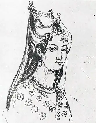 The fate of Mariam Dadiani, dowager queen of Kartli and widow of Rostom, is not immediately clear. Afraid of being deported to Iran to join the shah's harem, she first sent him a lock of her white hair to demonstrate her advanced age, while showing her face as much as possible in public.[33] The shah then forced Vakhtang V to marry her so that she could stay in Georgia.[33] Vakhtang, then married to his first wife Rodam Qaplanishvili, a woman of "rare beauty", was forced to divorce her (or, according to some sources, to dismiss her as a secondary wife according to Persian tradition) in order to marry Mariam.[34] Despite the original opposition of Vakhtang V, he was forced to cave in to the pressure exerted by the Persian delegates.[33]