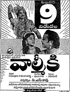 Valmiki is 1963 Indian Telugu-language Hindu mythological film, based on the life of Valmiki, produced by S. K. Habibulla under Jupiter Pictures and directed by C. S. Rao. The films stars N. T. Rama Rao, Rajasulochana and Leelavathi with music composed by Ghantasala.[1][2] Director Rao and Jupiter Pictures made the film simultaneously in Kannada with the same title starring Rajkumar in the lead role retaining most of the cast and crew.