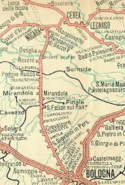 The line continues to San Felice sul Panaro, turning to serve the town of Mirandola, served by a slightly relocated station, which uses the old station buildings. The line then runs directly to Crevalcore station. On this section is the Camposanto station near the bridge over the Panaro river, which was reopened with the duplication. On the same section is the former Bolognina station, which was closed when the railway was duplicated. Crevalcore was the site of the former junction with the disused Ferrara-Modena railway managed by the Società Veneta ("Veneta Company"). After Crevalcore, the railway turns to the south-east and runs parallel to that of Highway 568 via San Giovanni in Persiceto and Tavernelle d'Emilia. A branch of the former Ferrara–Modena railway branched off at San Giovanni in Persiceto station to Decima, but was destroyed by bombing during World War II.