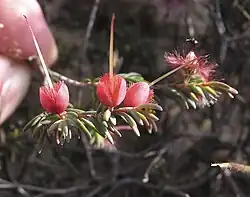 The flowers are arranged in small, pendulous groups near the ends of the branches, each flower on a stalk 1–2 mm (0.04–0.08 in) long. As they open, the flowers are surrounded by pink or red bracteoles that soon fall off. The floral cup is top-shaped, about 2.0–2.5 mm (0.08–0.1 in) long, with 10 prominent ribs and is hairy near its base. The sepals are pink to red or maroon, 3–4.5 mm (0.1–0.2 in) long, with 4 to 6 hairy lobes. The petals are egg-shaped, white, red, orange or maroon and 2.0–2.5 mm (0.08–0.1 in) long and are densely hairy on the outside. The style is gently curved, 12–16 mm (0.5–0.6 in) long with a few short hairs on one side, near the tip. Flowering time can occur in almost any month but mostly from August to November.[2][3]