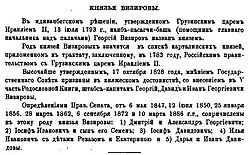 Its founder accompanied Rostom Khan to Kartli and was confirmed in the princely rank in 1634. In the mid-18th century, the family converted to Georgian Orthodox Christianity. Their estates lay in the province of Shida Kartli. The Princes Vezirishvili were listed among the Georgian nobility in a special document attached to the Russo-Georgian Treaty of Georgievsk of 1783. After the Russian takeover of Georgia, the family was received into Russian nobility as Knyaz Vizirov (Князья Визировы) in 1828.[1][2][3]